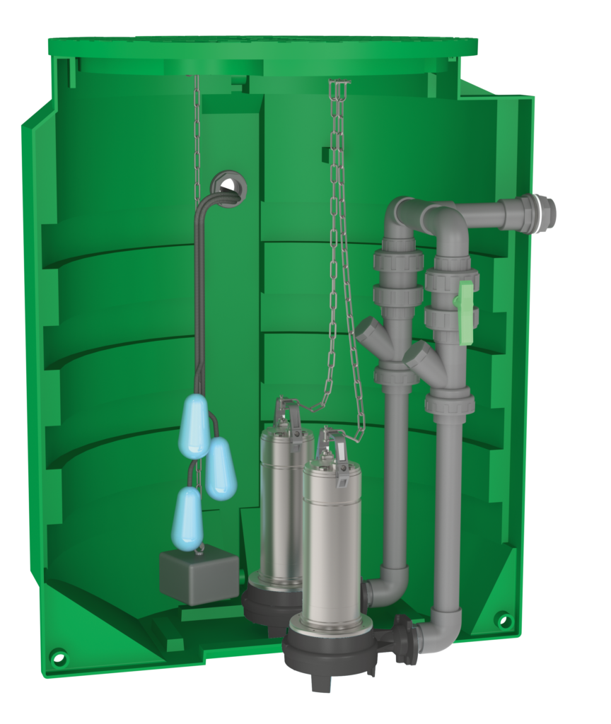 1 passage de paroi en PVC Ø 50 x 2“ pour le passage des câbles pompes et flotteurs.