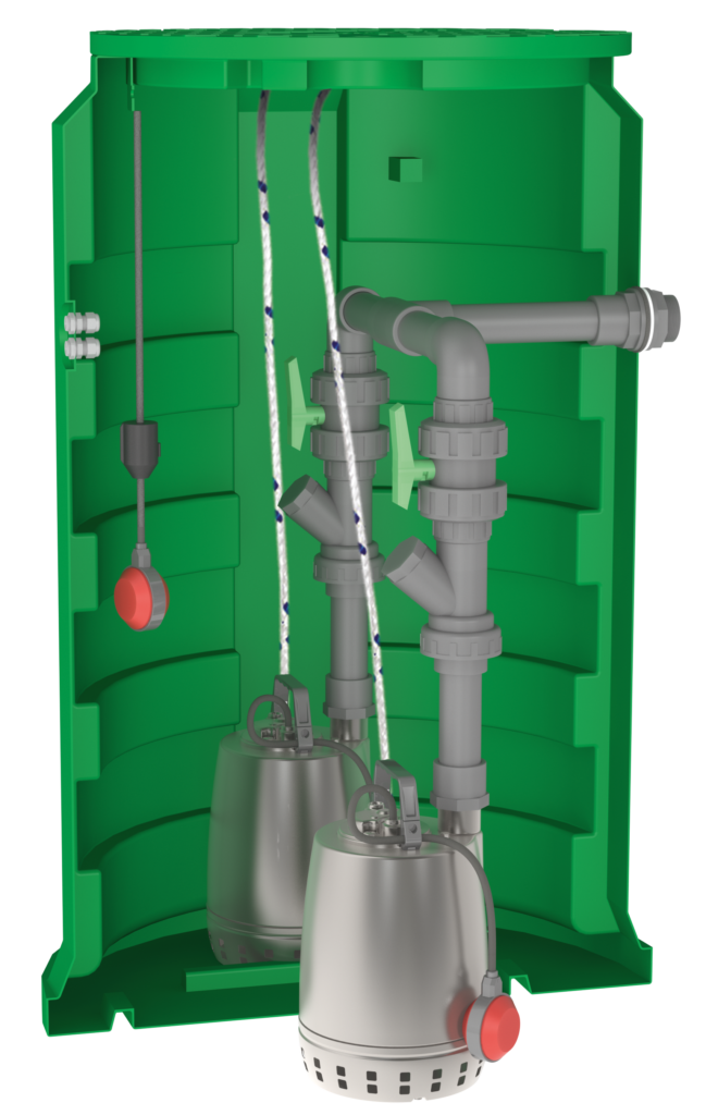 2 pompes de relevage en inox spéciale eaux claires ou légèrement chargées (passage 12 mm) livrée avec 20 m de câble + 1 flotteur réglable pour marche/arrêt.